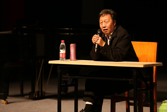 王志信老师是我国著名作曲家,代表作有《桃花红,杏花白》,《昭君出塞》,《兰花花》等广泛传唱的作品。在公开课中王志信老师与师生们交流了他对音乐的理解和对当今音乐的看法。王老师主张声乐要“注重情感”。他说:“当感情和声音遇到冲突时,歌唱的方法要为情感让路。”其间,王老师演唱了一段《敢问路在何方》,为同学们做了声乐中要“刚柔并济”的示范,虽然没有嘹亮的嗓音,但王老师对作品的理解和充沛情感的表达方式,深深的打动了在座的师生,得到了雷鸣般的掌声。随后王志信老师给12位音乐系的学生指导了声乐作品,同学们求知若渴,面对同学们不同的缺点,王老师用幽默的语言,生动的示范,在短短几分钟的时间内使同学有了明显的进步,他注重的“以情带声”使同学们受益匪浅。